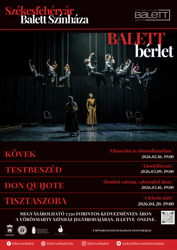Legyél Te is bérletes nézőnk! 2025 őszén is Balett Bérlet! A bérlettel szeptembertől novemberig 4 izgalmas táncszínházi estére várjuk a táncszínház szerelmeseit a székesfehérvári Vörösmarty Színházban. A bérletben egy premier, illetve három nagy sikerű produkció kapott helyet: Törésvonalak - 2025. szeptember 8. 19:00 Carmen - 2025. október 20. 19:00 Don Quijote (premier) - 2025. november 19. 19:00 Aladdin - 2025. november 24. 19:00 A 2025 második félévére szóló balett bérletet 7350 forintos áron vásárolhatod meg, személyesen a Vörösmarty Színház jegyirodájában, hétköznap 10 és 18 óra között, valamint online az alábbi linken: https://vorosmartyszinhaz.jegy.hu/seasonticket/buy/387/449 Szeretettel várjuk nézőinket 2025 őszén is!